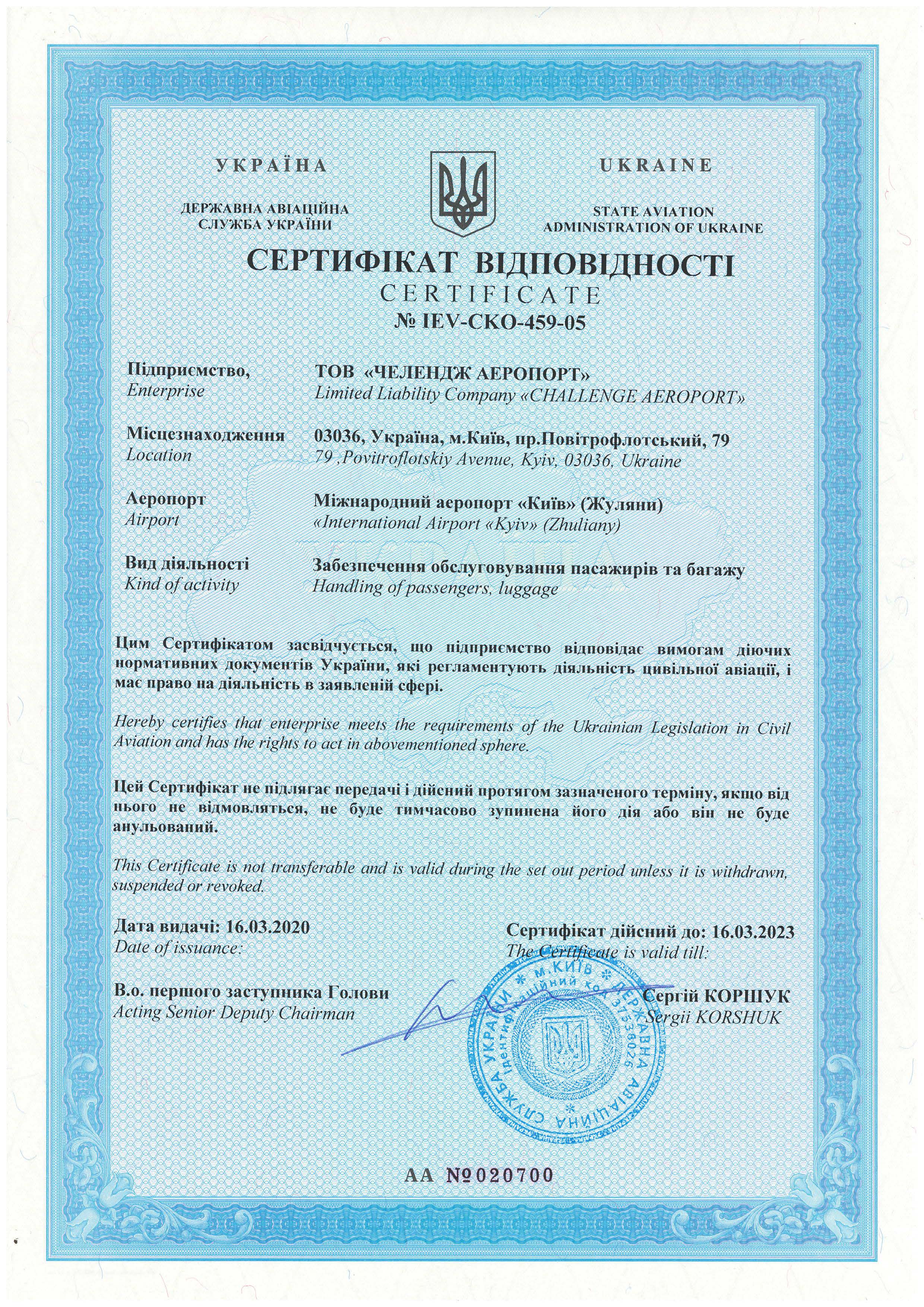 Challenge Aeroport полностью сертифицирован Украинским Департаментом Гражданской авиации на оказание услуг по наземному обслуживанию с собственным техническим оборудованием и персоналом.